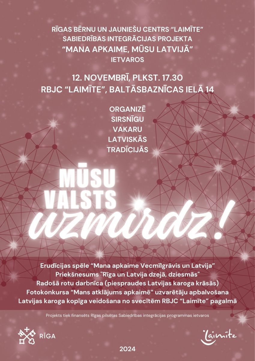 Cienījamie Rīgas iedzīvotāji! Aicinām uz Rīgas bērnu un jauniešu centru "Laimīte", kur integrācijas projekta “Mana apkaime, mūsu Latvijā” ietvaros notiks divi "Mūsu valsts uzmirdz" pasākumi: