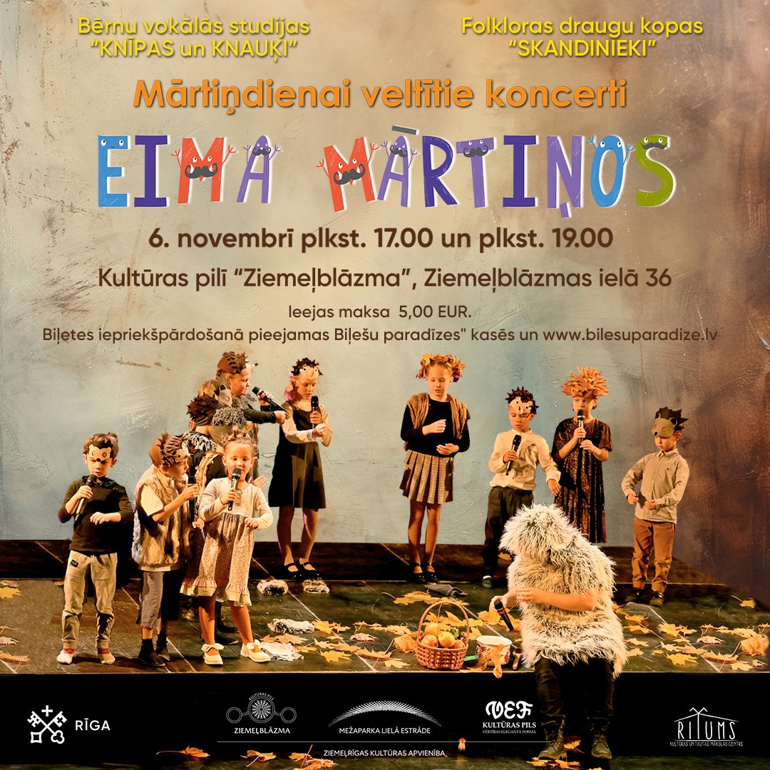 6. novembrī plkst. 17.00 un plkst. 19.00 Kultūras pilī “Ziemeļblāzma”, Ziemeļblāzmas ielā 36, ikviens aicināts uz Mārtiņdienai veltītiem koncertiem “Eima Mārtiņos”.