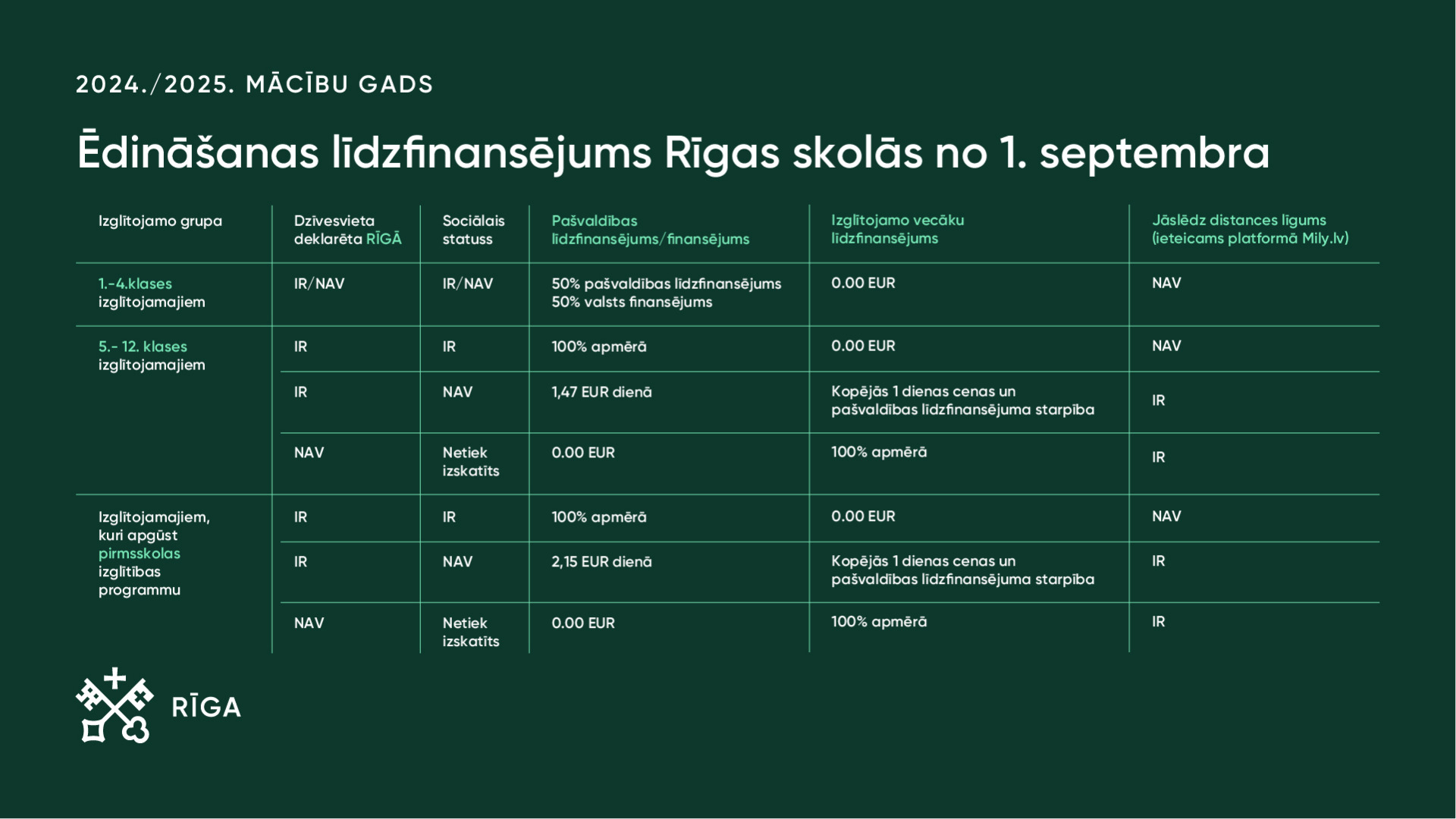 Jau ziņots, ka 2023. gadā tika veiktas izmaiņas Rīgas pašvaldības saistošajos noteikumos “Kārtība, kādā Rīgas valstspilsētas pašvaldība nodrošina izglītojamo ēdināšanas pakalpojuma līdzfinansējumu”, kuros paredzēts, ka pašvaldība primāri atbalsta noteiktu sociālo grupu izglītojamos un pašvaldības administratīvajā teritorijā deklarētos skolēnus (arī valsts un privātu izglītības iestāžu izglītojamos).