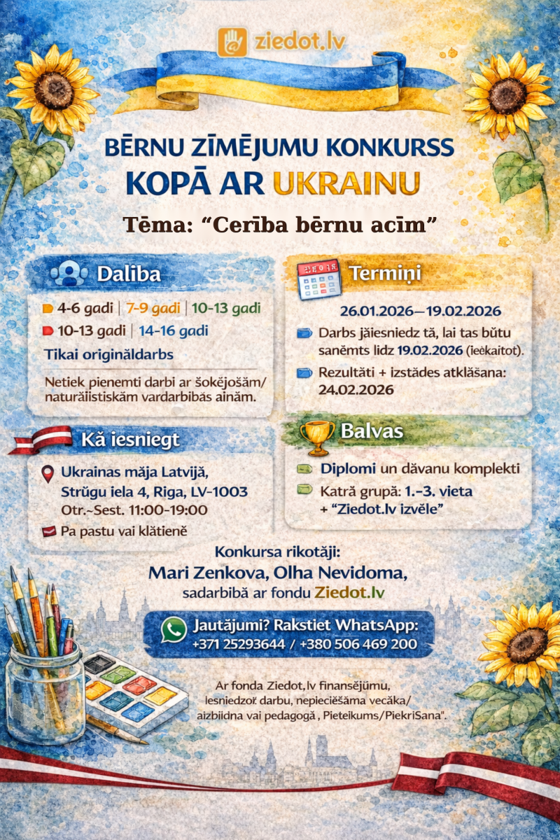 Bērnu zīmējumu konkurss “Kopā ar Ukrainu” ir veltīts pilna mēroga kara sākuma gadadienai Ukrainā. Konkursu rīko Marijas Zeņkovas un Olhas Nevidomas radošās apvienības ar fonda Ziedot.lv finansiālu atbalstu.