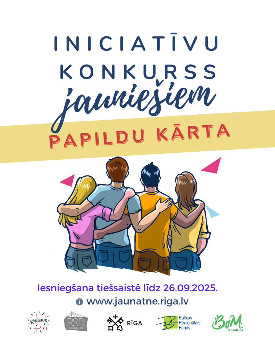 Rīgas valstspilsētas pašvaldības Izglītības, kultūras un sporta departaments izsludina 2025.gada Jauniešu iniciatīvu konkursa papildu kārtu, kurā aicināti piedalīties Rīgas jaunieši un jauniešu grupas vecumā no 13 līdz 20 gadiem, kā arī Rīgas skolu skolēnu pašpārvaldes.