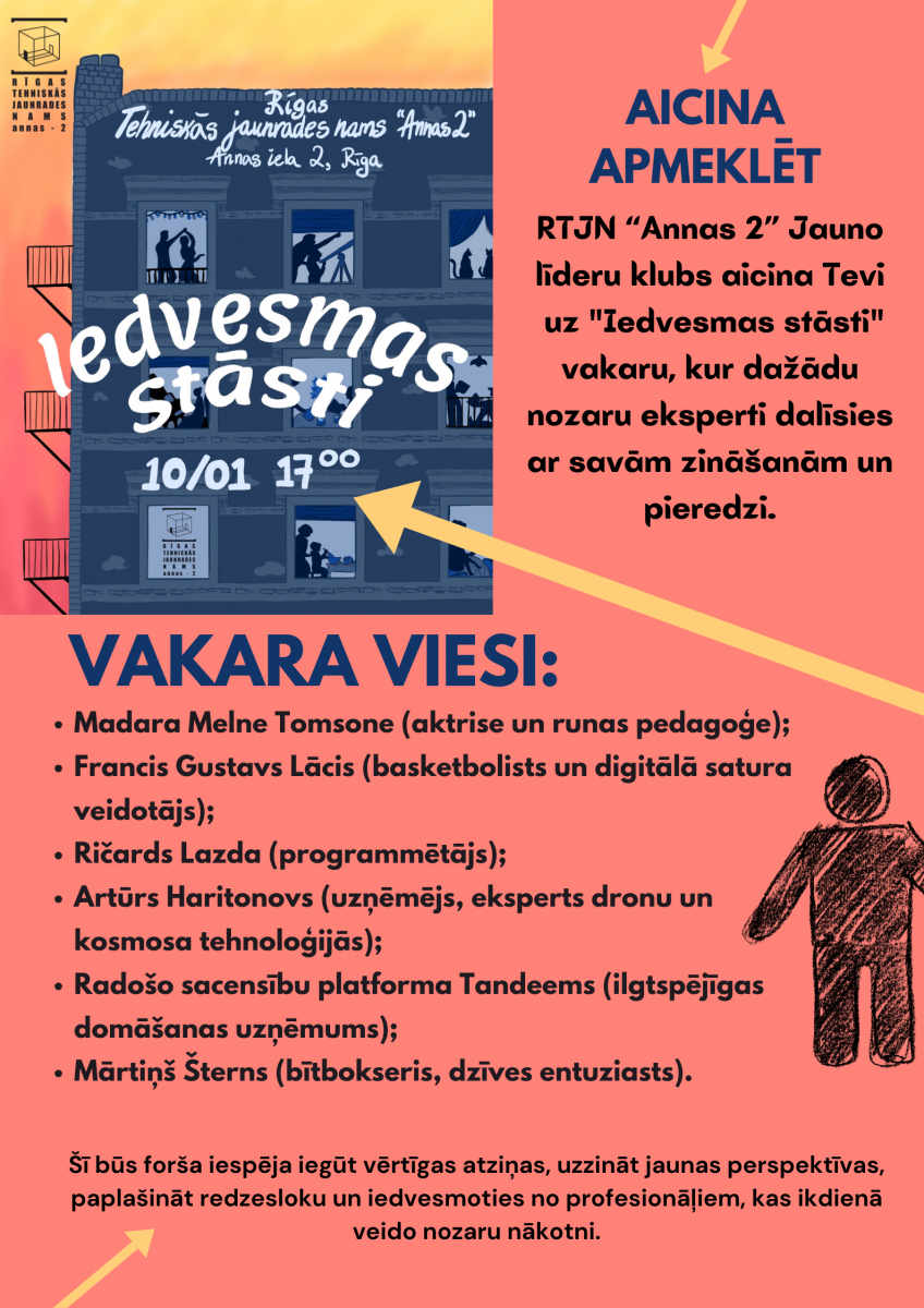 10. janvārī plkst. 17.00 Rīgas Tehniskās jaunrades nama “Annas 2” Jauno līderu klubs (Annas ielā 2, Rīgā) aicina Tevi uz "Iedvesmas stāsti" vakaru, kur dažādu nozaru eksperti dalīsies ar savām zināšanām un pieredzi. Šī būs forša iespēja iegūt vērtīgas atziņas, uzzināt jaunas perspektīvas, paplašināt redzesloku un iedvesmoties no profesionāļiem, kas ikdienā veido nozaru nākotni.