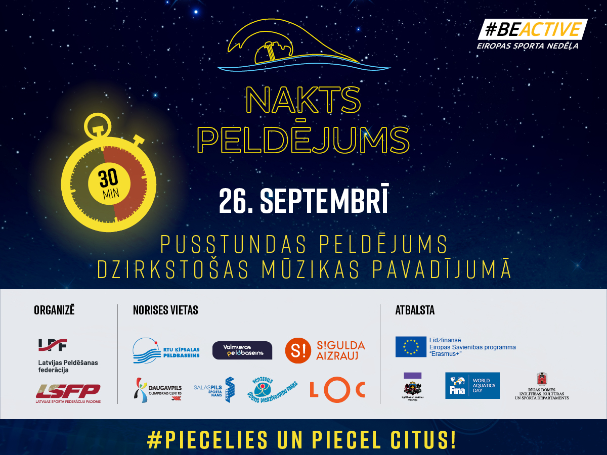 Šī gada 26.septembrī jau tradicionāli Eiropas Sporta nedēļas ietvaros norisināsies viens no skanīgākajiem un vērienīgākajiem aktīvā dzīves veida pasākumiem - Nakts peldējums, kura ietvaros septiņās Latvijas pilsētās iedzīvotājiem un to viesiem būs iespēja ne vien izbaudīt patīkamu peldi pozitīvas dzīvās mūzikas un apgaismojuma pavadījumā, bet arī izaicināt sevi pusstundas peldējumā.