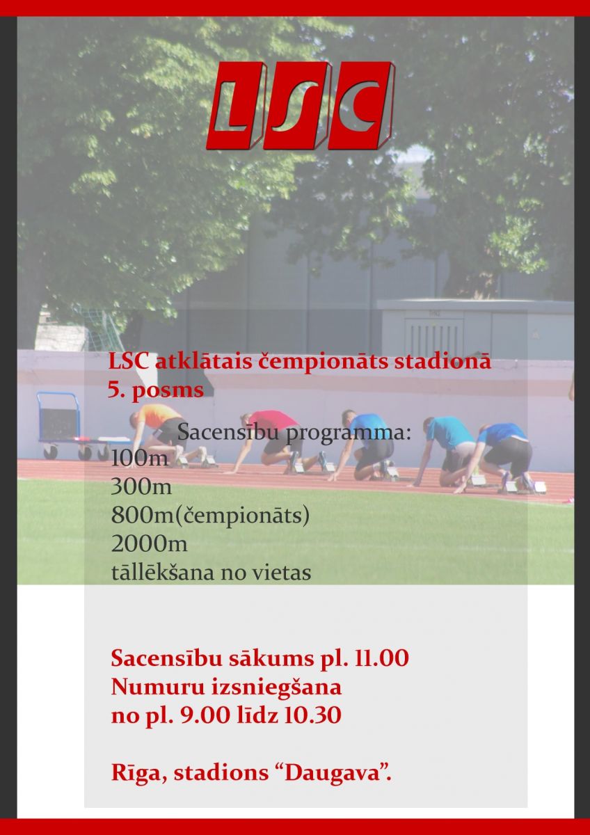 5. septembrī plkst. 11.00 Rīgā, stadionā "Daugava" notiks LSC atklātais čempionāts stadionā 5. posms. Sacensību programma: 100m, 300m, 800m (čempionāts),2000 m, tāllēkšana no vietas.