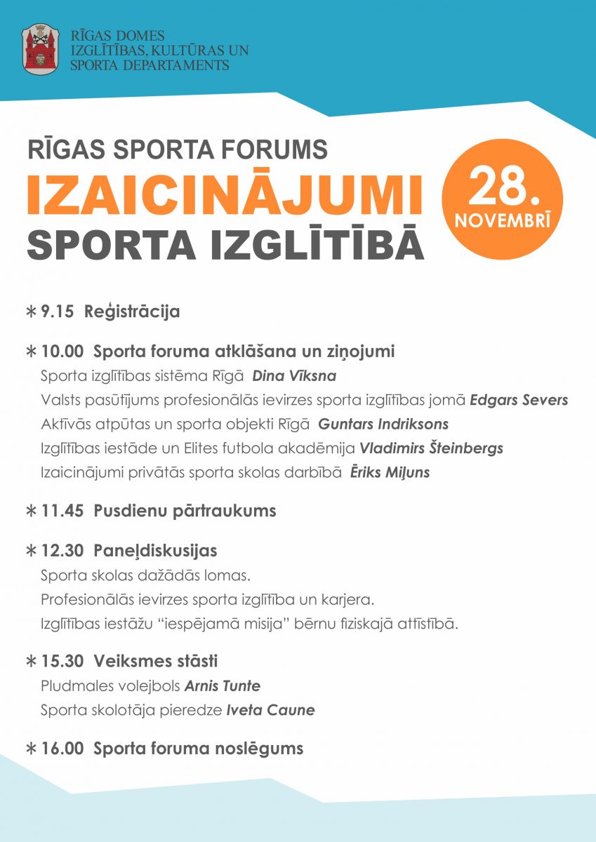 Rīgas sporta forumā klātesošos uzrunās Rīgas domes Izglītības, kultūras un sporta departamenta (RD IKSD) direktors Guntis Helmanis. RD IKSD Sporta un jaunatnes pārvaldes priekšniece Dina Vīksna informēs par sporta izglītības sistēmu Rīgā, Izglītības un zinātnes ministrijas Sporta departamenta direktors Edgars Severs par valsts pasūtījumu profesionālās ievirzes sporta izglītības jomā. Sporta foruma dalībnieki varēs iepazīties ar aktīvās atpūtas un sporta objektu pieejamību Rīgā, kā arī uzzināt par izaicinājumiem gan pašvaldības, gan privāto sporta skolu darbībā.