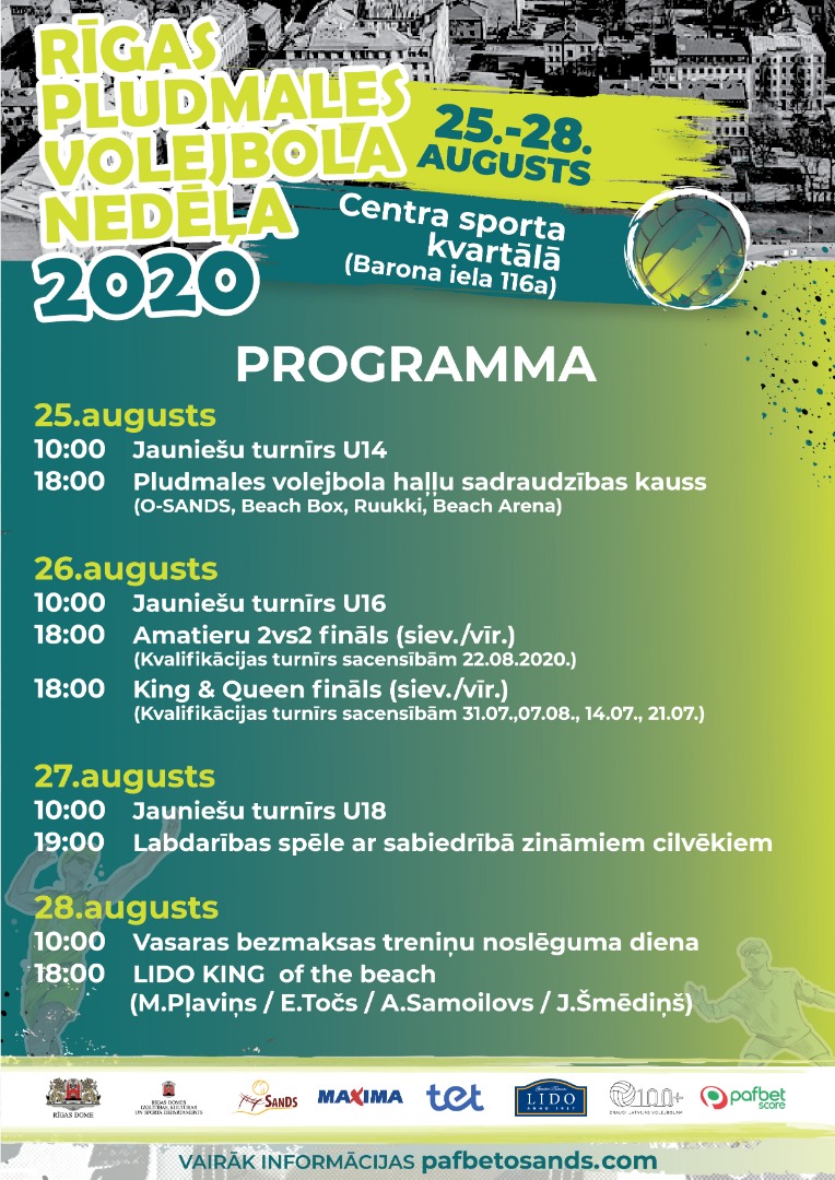 Arī šogad, skaisti noslēdzot vasaras sezonu, no 25. līdz 28. augustam Rīgas centrā norisināsies Rīgas pludmales volejbola nedēļa, kas iepriekšējos divus gadus norisinājās Doma laukumā. Šoreiz pasākumam izvēlēta ne mazāk īpaša vieta – Centra sporta kvartāls, Kr.Barona ielā 116a, kur, kā ierasts, visi pludmales volejbola cienītāji tiek aicināti piedalīties un baudīt šo sporta veidu.