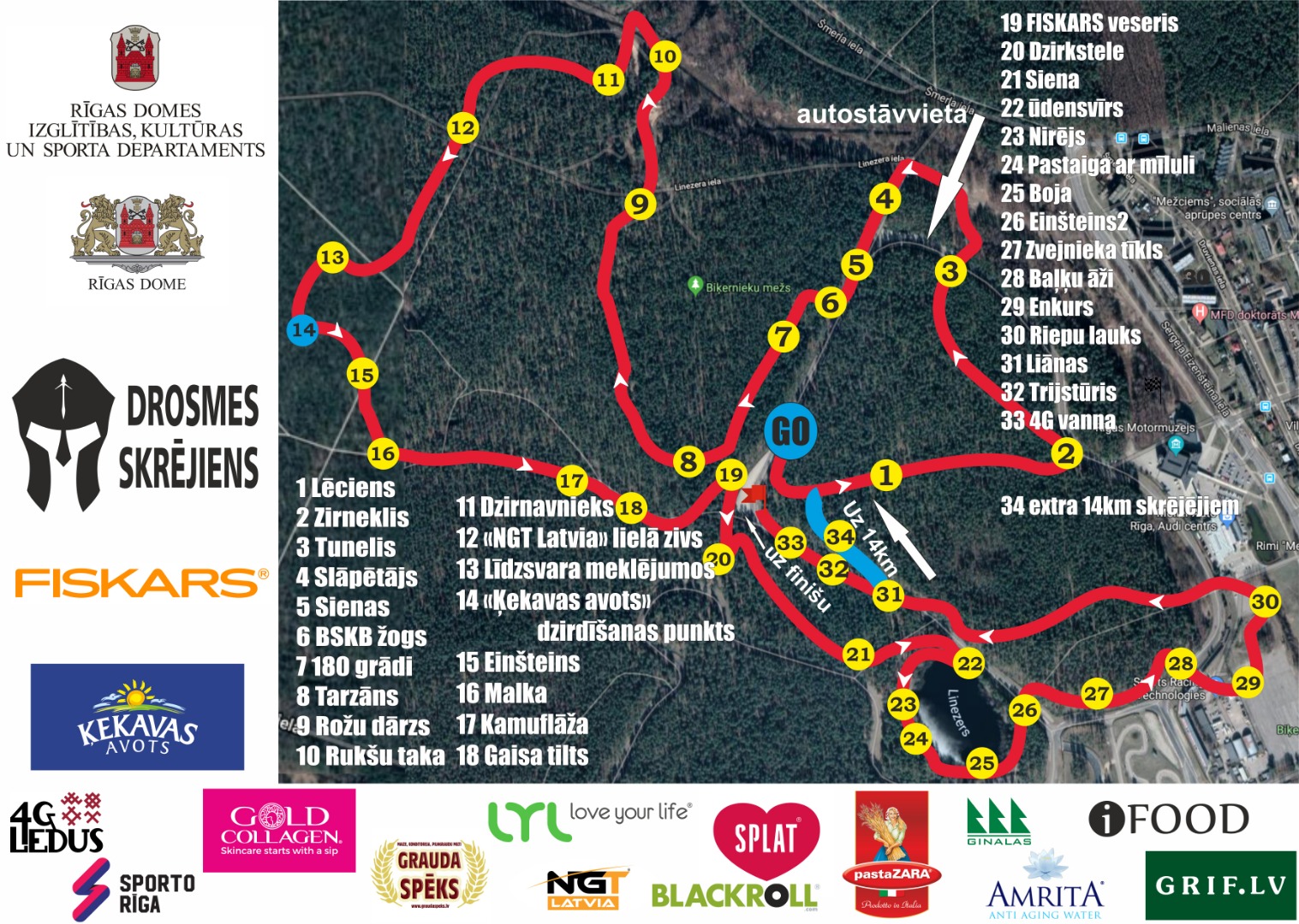 Trasē būs SIA “Ķekavas avots” dzeramais punkts, kā arī Ķekavas avota ūdens pudele finišā. Pirms katra starta drosmīgos iesildīs treneri no Sporto Rīga, kuri arī aktīvi paši veido komandas un piedalās sacensībās. Medaļa un zobupasta SPLAT katram finišējušajam dalībniekam. Godalgotās vietas tiks apbalvotas ar balvām no dažādiem sponsoriem. Nokļūšana ir gan ar kājām no apkārt esošajiem rajoniem, gan sabiedrisko transportu, gan privāto auto. Tuvākā pietura sabiedriskajam transportam (15., 21. autobuss). Liela autostāvvieta būs pie ieejas pasākumā Linezera ielā, trasē. Drosmīgie var iet arī no Biķernieku trases galvenās ieejas, pie reizes iesildoties skrējienam (18. trolejbuss, 5., 31., 15. autobuss).