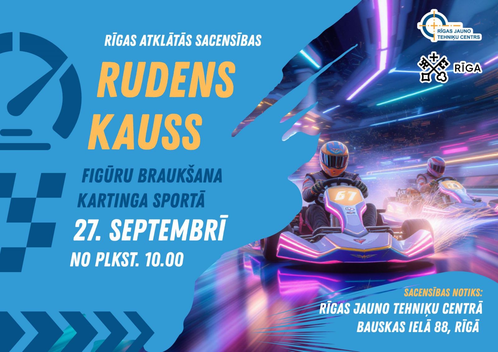 Rīgas Jauno tehniķu centrs sadarbībā ar Rīgas valstspilsētas pašvaldības Izglītības, kultūras un sporta departamenta Sporta un jaunatnes pārvaldi 27.septembrī rīko Rīgas atklātās sacensības “Rudens kauss” figūru braukšana kartinga sportā.