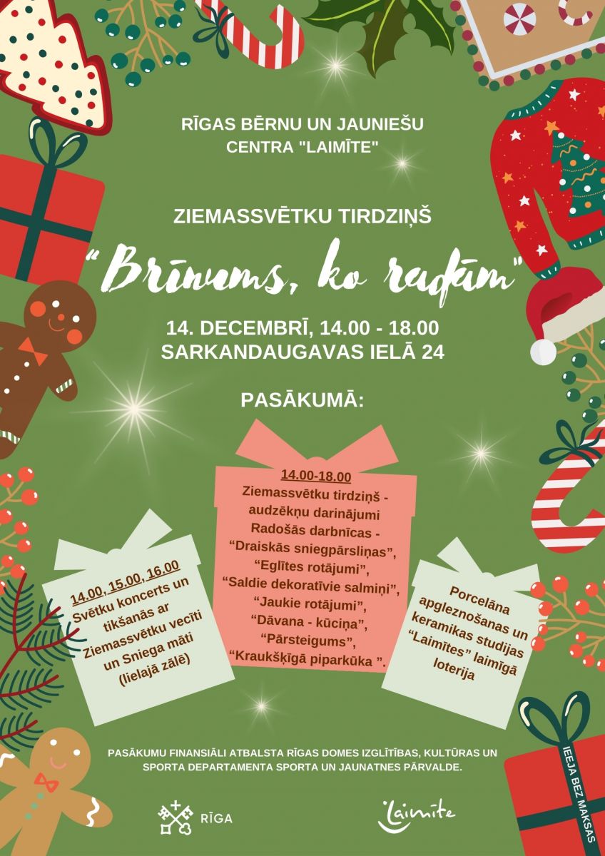 Hei! Hei! Hei! 2024. gada 14. decembrī no plkst. 14.00 līdz 18.00 Rīgas Bērnu un jauniešu centrs “Laimīte” (Sarkandaugavas ielā 24) visus gaida Ziemassvētku tirdziņā! Rīgas apkaimju iedzīvotāji, bērni un jaunieši interešu izglītības pulciņu audzēkņi, ģimenes locekļi, draugi! Sanāciet, atbrauciet!