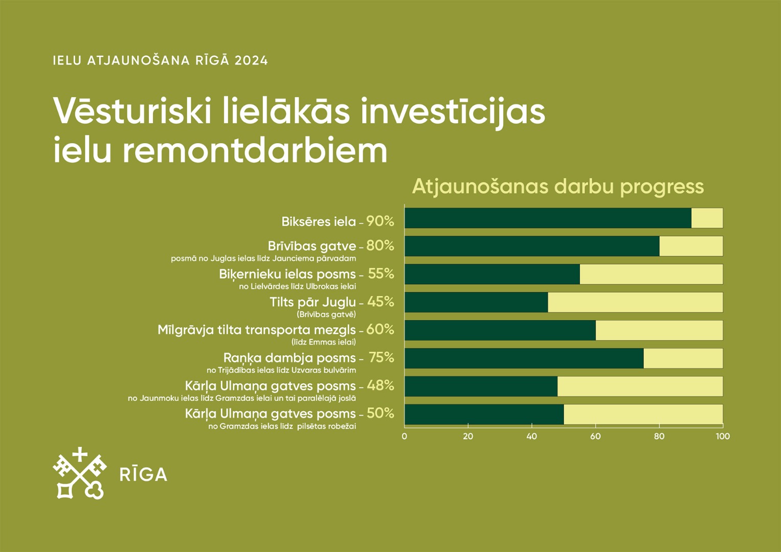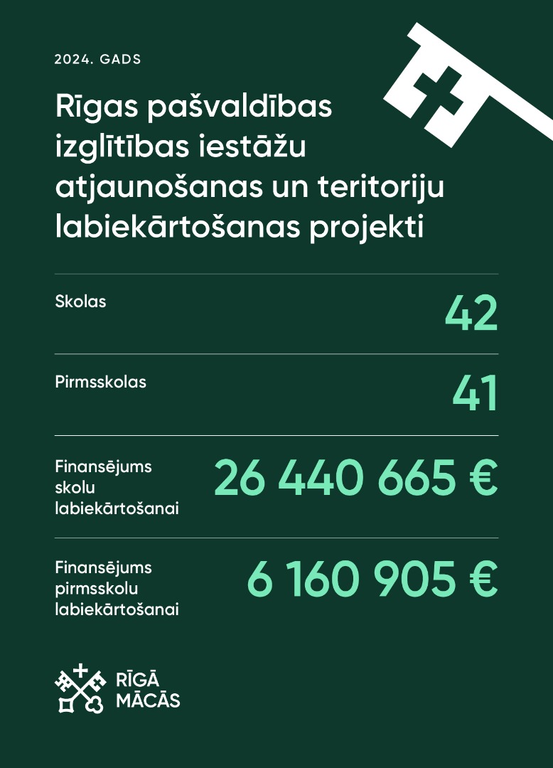 Kopumā telpu remontdarbi, ēku atjaunošanas un teritoriju labiekārtošanas darbi šogad notiek 42 skolās, tostarp sporta skolās, par kopējo summu 26,4 miljoni eiro, kā arī 41 pirmsskolas izglītības iestādē par kopējo līgumu summu 6,2 miljoni eiro. Tāpat šogad pieņemti Rīgas domes lēmumi par Skanstes pirmsskolas ēkas celtniecību Grostonas ielā 6 un Mežaparka sākumskolas būvniecību. Abus projektus plānots sākt 2025.gadā.