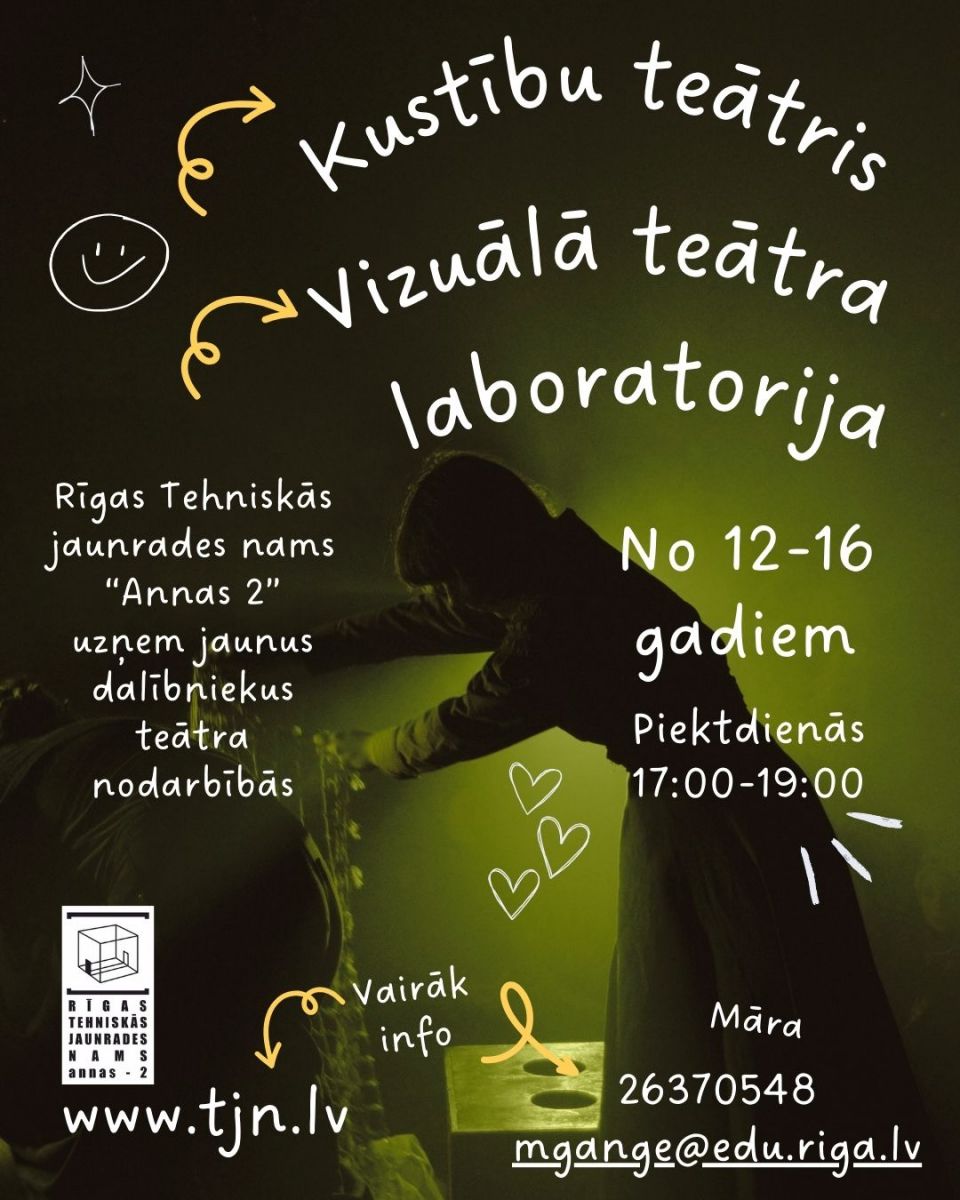 Rīgas Tehniskās jaunrades nams “Annas 2” uzņem audzēkņus Vizuālā teātra studijā un Kustību teātra pulciņā, no 12 līdz 16 gadu vecumam.