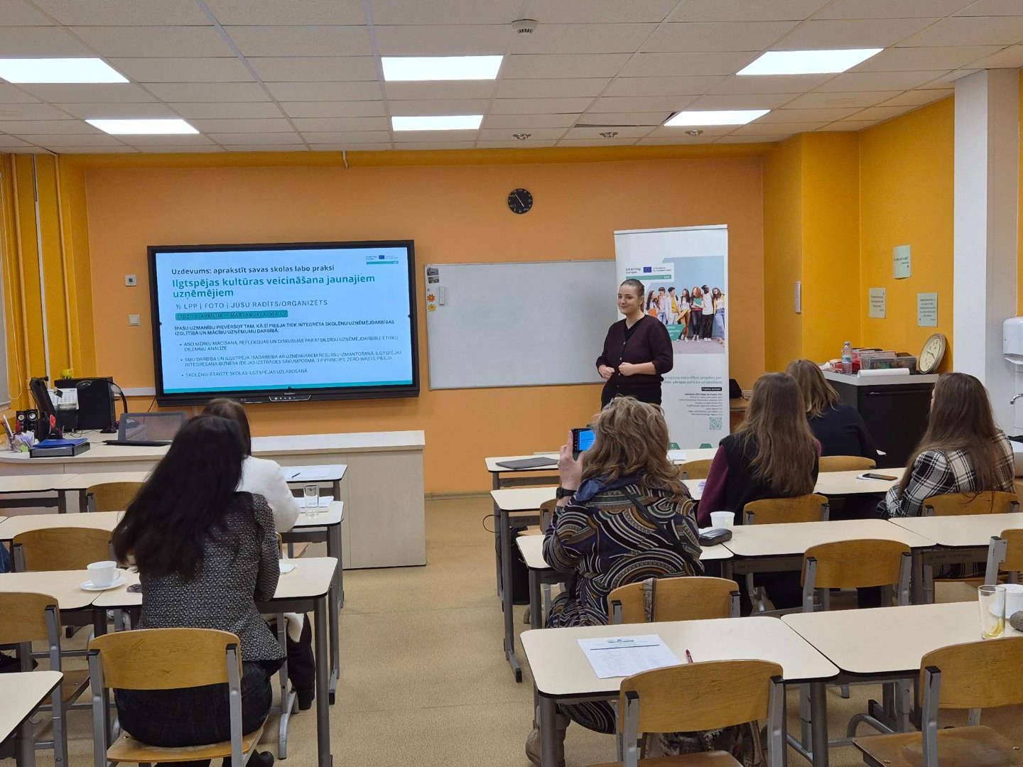 Par ilgtspējas kultūru un aprites ekonomikas nozīmi uzņēmējdarbības izglītībā stāstīja Ieva Kalniņa, Rīgas enerģētikas aģentūras starptautisko projektu vadītāja. Prezentācijā tika akcentēts, ka ilgtspējība uzņēmējdarbībā sākas jau produkta izstrādes posmā, un skolēnu mācību uzņēmumi ir būtiska platforma šo principu praktiskai apguvei. Dalībnieki iepazinās arī ar iniciatīvu “Sadarbnīca”, kas veicina labošanas, atkārtotas izmantošanas un aprites ekonomikas praksi.